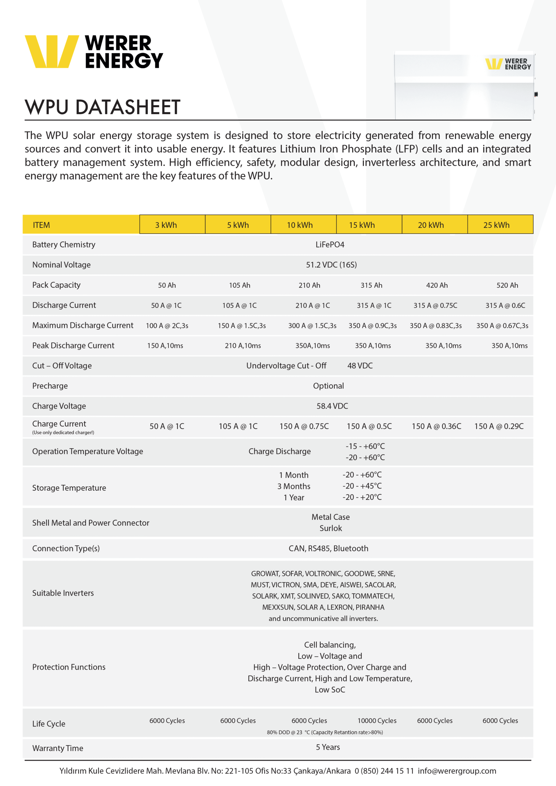 WPU güneş enerjisi depolama sistemi, yenilenebilir enerji kaynaklarından üretilen elektriği depolayarak enerji ihtiyaçlarınızı karşılamak için tasarlanmıştır. Lityum Demir Fosfat (LFP) hücreleri ve entegre batarya yönetim sistemi (BMS) ile güvenli, verimli ve uzun ömürlü bir enerji depolama çözümü sunar. WPU modeli, yüksek enerji verimliliği, gelişmiş güvenlik önlemleri ve akıllı enerji yönetimi ile kullanıcı dostu bir deneyim sunar. Bu sistem, enerjiyi depolayarak günün her saatinde ihtiyaç duyduğunuzda kullanabilmenizi sağlar ve sürdürülebilir enerji kullanımı sağlar.